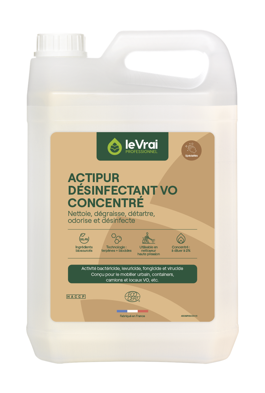 ENZYPIN ACTIPUR PROPRETÉ URBAINE / VIDE-ORDURES est un détergent désinfectant virucide concentré écocertifié qui nettoie, désinfecte et odorise les mobiliers urbains, les aires de jeux, les rampes et cages d’escaliers des parkings, les WC publics, les containers et locaux vide-ordures, etc. Formulation concentrée à base d’acide lactique, substance active BIOSOURCÉE issue de la fermentation du sucres, certifiée ECOCERT.